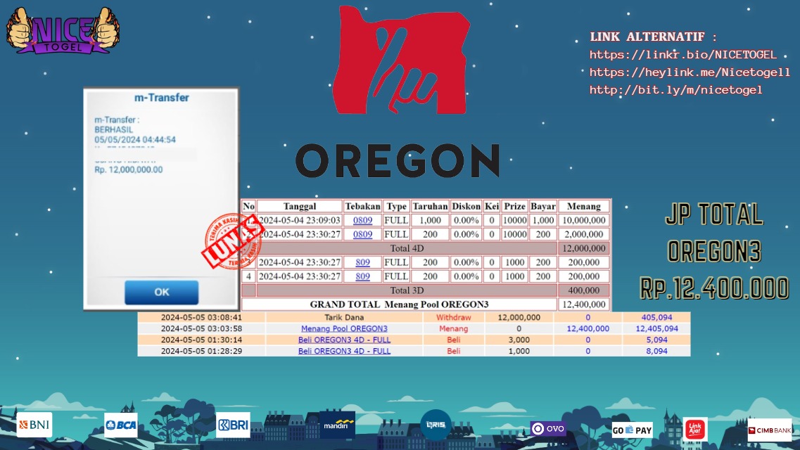 Selamat kepada User id : Kuc** Telah berhasil mendapatkan kemenangan besar pada permainan TOGEL OREGON 3 Dengan kemenangan Sebesar Rp.12.400.000,- Setelah mengisi formulir withdraw dengan kurung waktu hanya 5 – 10 menit pihak NICETOGEL sudah melakukan transfer kepada pemilik Userid dan dana sudah dapat di cairkan oleh pemenang. Bukti pembayaran yang kami berikan merupakan bukti pembayaran yang SAH / VALID yang langung di dapatkan melaui tanda transfer transaksi dari Bank yang di tuju.