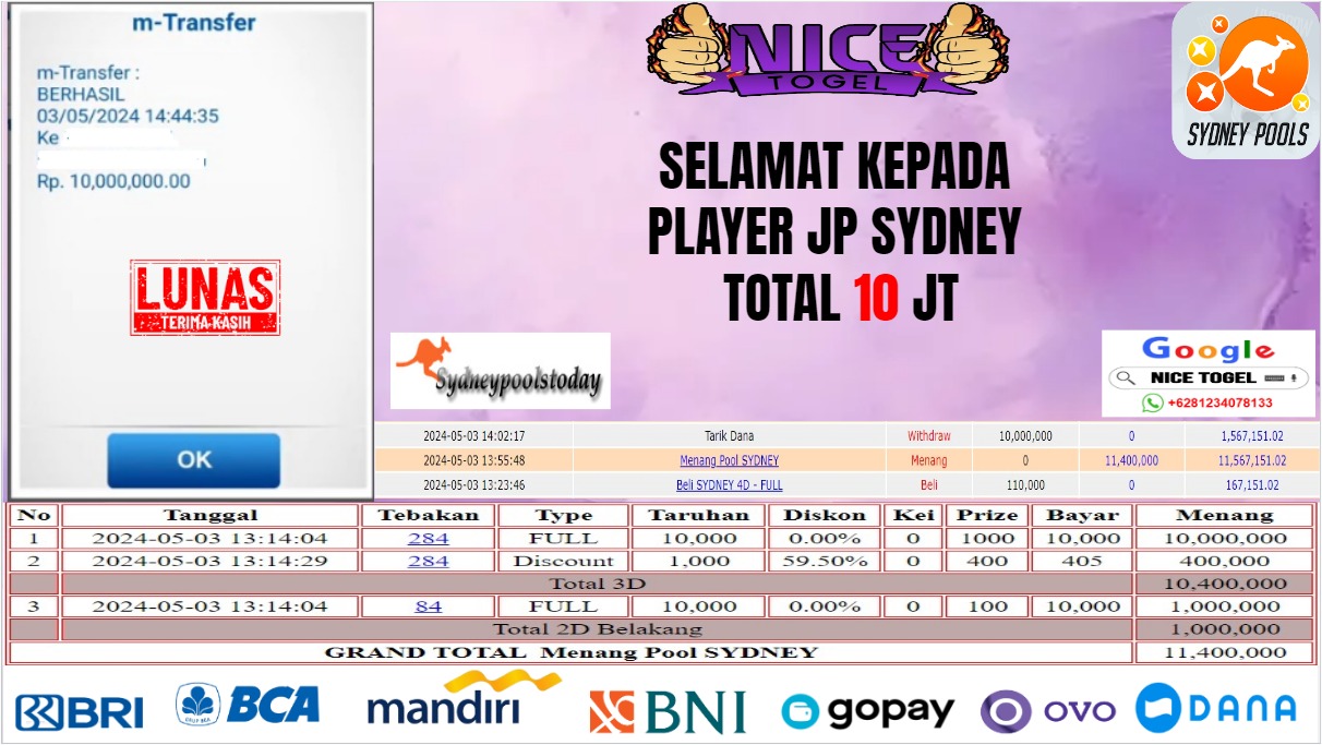 Selamat kepada User id : sae*** Telah berhasil mendapatkan kemenangan besar pada permainan TOGEL SYDNEY POOLS Dengan kemenangan Sebesar Rp.10.000.000,- Setelah mengisi formulir Withdraw dengan kurung waktu hanya 5 – 10 menit pihak NICETOGEL sudah melakukan transfer kepada pemilik Userid dan dana sudah dapat di cairkan oleh pemenang. Bukti pembayaran yang kami berikan merupakan bukti pembayaran yang SAH / VALID yang langung di dapatkan melaui tanda transfer transaksi dari Bank yang di tuju.