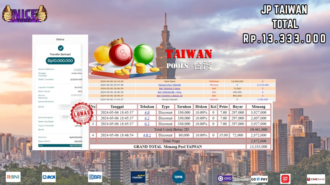 Selamat kepada User id : jm** Telah berhasil mendapatkan kemenangan besar pada permainan TOGEL TAIWAN Dengan kemenangan Sebesar Rp.13.333.000,- Setelah mengisi formulir withdraw dengan kurung waktu hanya 5 – 10 menit pihak NICETOGEL sudah melakukan transfer kepada pemilik Userid dan dana sudah dapat di cairkan oleh pemenang. Bukti pembayaran yang kami berikan merupakan bukti pembayaran yang SAH / VALID yang langung di dapatkan melaui tanda transfer transaksi dari Bank yang di tuju.