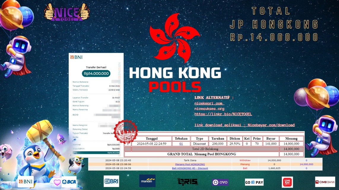 Selamat kepada User id : jesi** Telah berhasil mendapatkan kemenangan besar pada permainan TOGEL HONGKONG Dengan kemenangan Sebesar Rp.14.000.000,- Setelah mengisi formulir withdraw dengan kurung waktu hanya 5 – 10 menit pihak NICETOGEL sudah melakukan transfer kepada pemilik Userid dan dana sudah dapat di cairkan oleh pemenang. Bukti pembayaran yang kami berikan merupakan bukti pembayaran yang SAH / VALID yang langung di dapatkan melaui tanda transfer transaksi dari Bank yang di tuju.