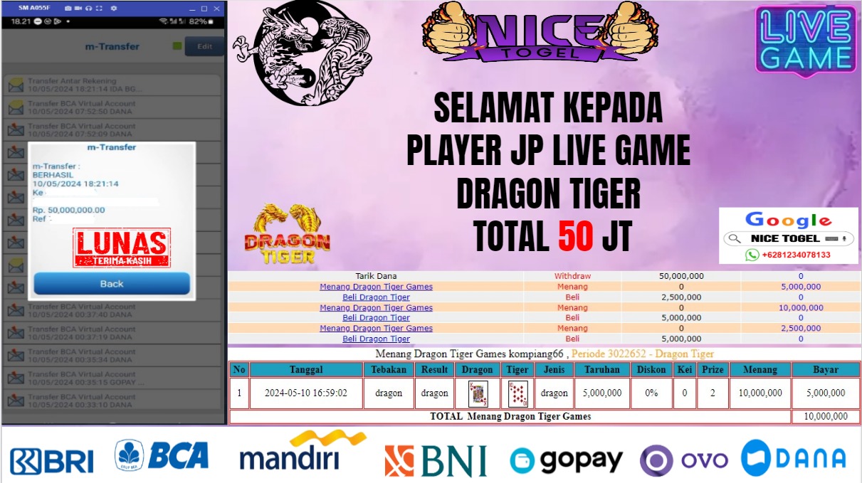 Selamat kepada User id : la***** Telah berhasil mendapatkan kemenangan besar pada permainan LIVE GAMES DRAGON TIGER Dengan kemenangan Sebesar Rp.50.000.000,- Setelah mengisi formulir withdraw dengan kurung waktu hanya 5 – 10 menit pihak NICETOGEL sudah melakukan transfer kepada pemilik Userid dan dana sudah dapat di cairkan oleh pemenang. Bukti pembayaran yang kami berikan merupakan bukti pembayaran yang SAH / VALID yang langung di dapatkan melaui tanda transfer transaksi dari Bank yang di tuju.