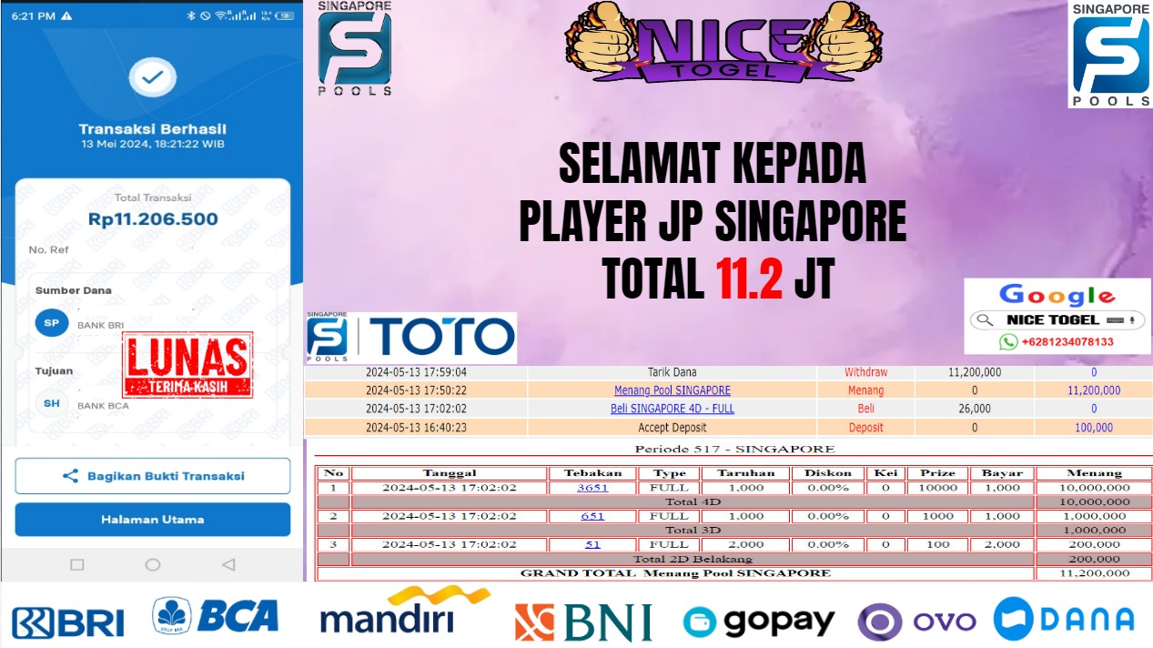 Selamat kepada User id : as*** Telah berhasil mendapatkan kemenangan besar pada permainan TOGEL SINGAPORE Dengan kemenangan Sebesar Rp.11.200.000,- Setelah mengisi formulir withdraw dengan kurung waktu hanya 5 – 10 menit pihak NICETOGEL sudah melakukan transfer kepada pemilik Userid dan dana sudah dapat di cairkan oleh pemenang. Bukti pembayaran yang kami berikan merupakan bukti pembayaran yang SAH / VALID yang langung di dapatkan melaui tanda transfer transaksi dari Bank yang di tuju.