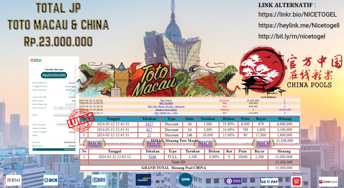 Selamat kepada User id : liar** Telah berhasil mendapatkan kemenangan besar pada permainan TOGEL TOTOMACAU & CHINA POOLS Dengan kemenangan Sebesar Rp.23.000.000,- Setelah mengisi formulir withdraw dengan kurung waktu hanya 5 – 10 menit pihak NICETOGEL sudah melakukan transfer kepada pemilik Userid dan dana sudah dapat di cairkan oleh pemenang. Bukti pembayaran yang kami berikan merupakan bukti pembayaran yang SAH / VALID yang langung di dapatkan melaui tanda transfer transaksi dari Bank yang di tuju.