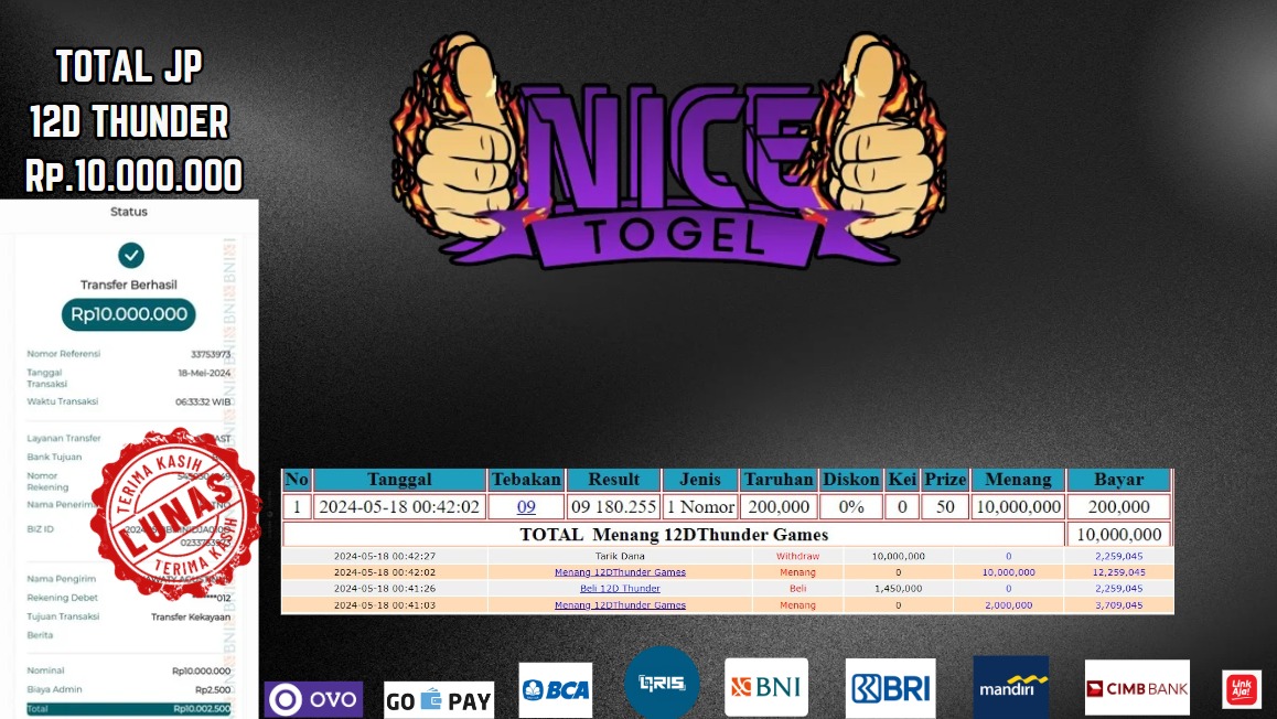 Selamat kepada User id : kr** Telah berhasil mendapatkan kemenangan besar pada permainan LIVE GAMES 12D THUNDER Dengan kemenangan Sebesar Rp.10.000.000,- Setelah mengisi formulir withdraw dengan kurung waktu hanya 5 – 10 menit pihak NICETOGEL sudah melakukan transfer kepada pemilik Userid dan dana sudah dapat di cairkan oleh pemenang. Bukti pembayaran yang kami berikan merupakan bukti pembayaran yang SAH / VALID yang langung di dapatkan melaui tanda transfer transaksi dari Bank yang di tuju.