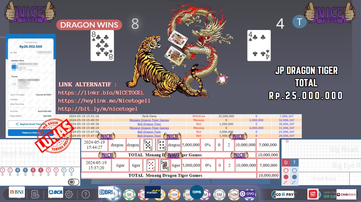 Selamat kepada User id : komp** Telah berhasil mendapatkan kemenangan besar pada permainan DRAGON TIGER Dengan kemenangan Sebesar Rp.25.000.000,- Setelah mengisi formulir withdraw dengan kurung waktu hanya 5 – 10 menit pihak NICETOGEL sudah melakukan transfer kepada pemilik Userid dan dana sudah dapat di cairkan oleh pemenang. Bukti pembayaran yang kami berikan merupakan bukti pembayaran yang SAH / VALID yang langung di dapatkan melaui tanda transfer transaksi dari Bank yang di tuju.