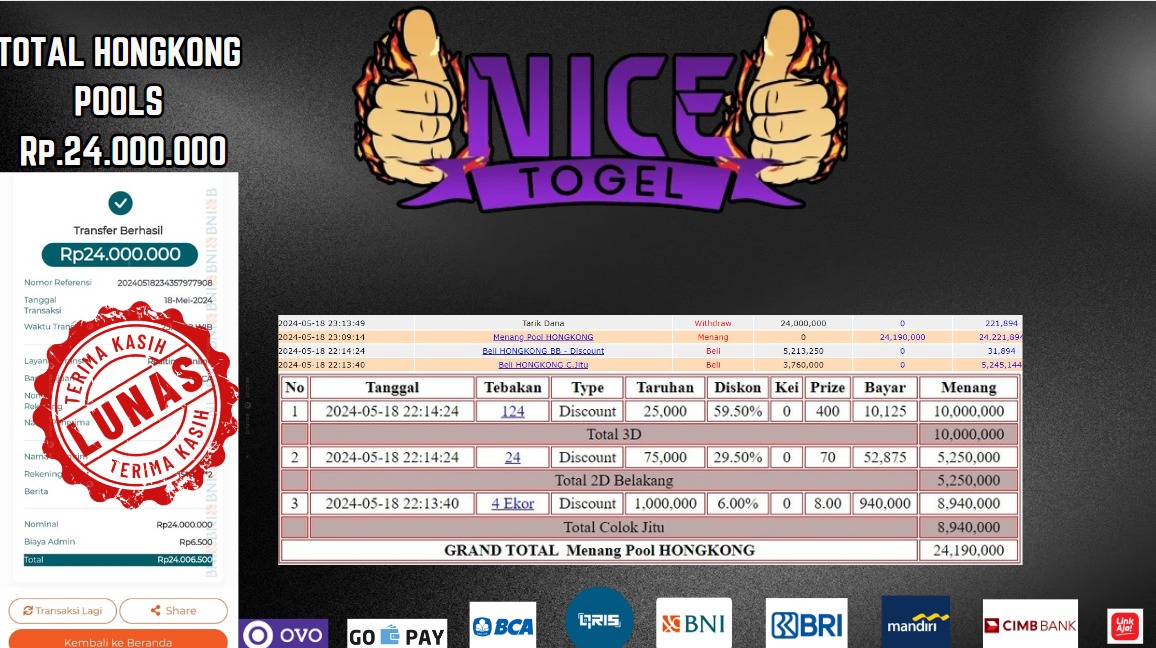 Selamat kepada User id : je** Telah berhasil mendapatkan kemenangan besar pada permainan TOGEL HONGKONG POOLS Dengan kemenangan Sebesar Rp.24.000.000,- Setelah mengisi formulir withdraw dengan kurung waktu hanya 5 – 10 menit pihak NICETOGEL sudah melakukan transfer kepada pemilik Userid dan dana sudah dapat di cairkan oleh pemenang. Bukti pembayaran yang kami berikan merupakan bukti pembayaran yang SAH / VALID yang langung di dapatkan melaui tanda transfer transaksi dari Bank yang di tuju.
