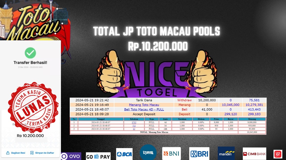 Selamat kepada User id : n** Telah berhasil mendapatkan kemenangan besar pada permainan TOGEL TOTOMACAU POOLS Dengan kemenangan Sebesar Rp.10.200.000,- Setelah mengisi formulir withdraw dengan kurung waktu hanya 5 – 10 menit pihak NICETOGEL sudah melakukan transfer kepada pemilik Userid dan dana sudah dapat di cairkan oleh pemenang. Bukti pembayaran yang kami berikan merupakan bukti pembayaran yang SAH / VALID yang langung di dapatkan melaui tanda transfer transaksi dari Bank yang di tuju.