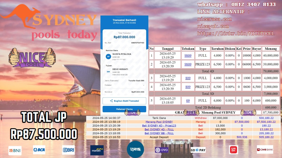 Selamat kepada User id : GRP** Telah berhasil mendapatkan kemenangan besar pada permainan TOGEL SYDNEY Dengan kemenangan Sebesar Rp.87.500.000,- Setelah mengisi formulir withdraw dengan kurung waktu hanya 5 – 10 menit pihak NICETOGEL sudah melakukan transfer kepada pemilik Userid dan dana sudah dapat di cairkan oleh pemenang. Bukti pembayaran yang kami berikan merupakan bukti pembayaran yang SAH / VALID yang langung di dapatkan melaui tanda transfer transaksi dari Bank yang di tuju.
