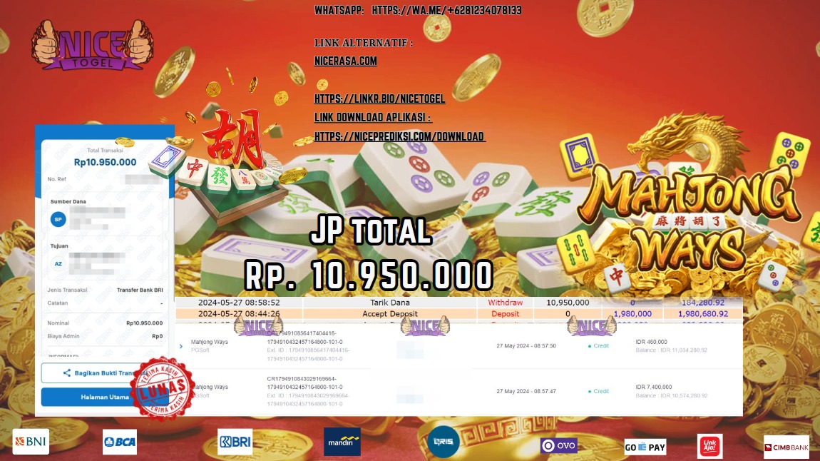 Selamat kepada User id : Dinz** Telah berhasil mendapatkan kemenangan besar pada permainan MAHYONG WAYS Dengan kemenangan Sebesar Rp.10.950.000,- Setelah mengisi formulir withdraw dengan kurung waktu hanya 5 – 10 menit pihak NICETOGEL sudah melakukan transfer kepada pemilik Userid dan dana sudah dapat di cairkan oleh pemenang. Bukti pembayaran yang kami berikan merupakan bukti pembayaran yang SAH / VALID yang langung di dapatkan melaui tanda transfer transaksi dari Bank yang di tuju.