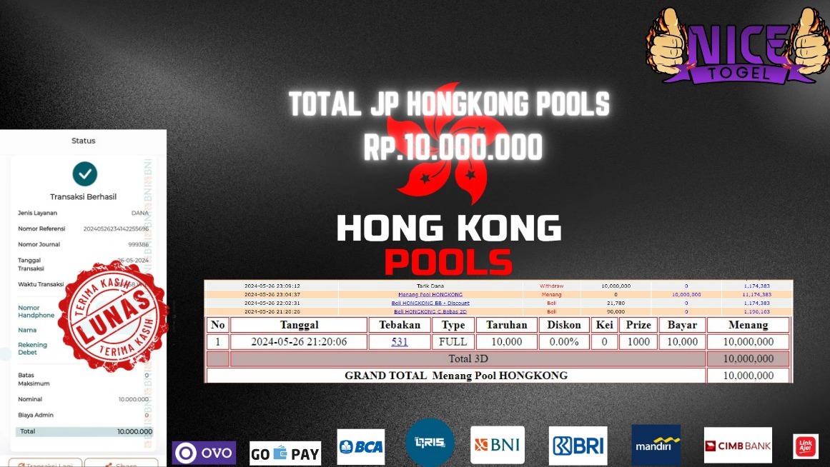 Selamat kepada User id : bu** Telah berhasil mendapatkan kemenangan besar pada permainan TOGEL HONGKONG POOLS Dengan kemenangan Sebesar Rp.10.000.000,- Setelah mengisi formulir withdraw dengan kurung waktu hanya 5 – 10 menit pihak NICETOGEL sudah melakukan transfer kepada pemilik Userid dan dana sudah dapat di cairkan oleh pemenang. Bukti pembayaran yang kami berikan merupakan bukti pembayaran yang SAH / VALID yang langung di dapatkan melaui tanda transfer transaksi dari Bank yang di tuju.