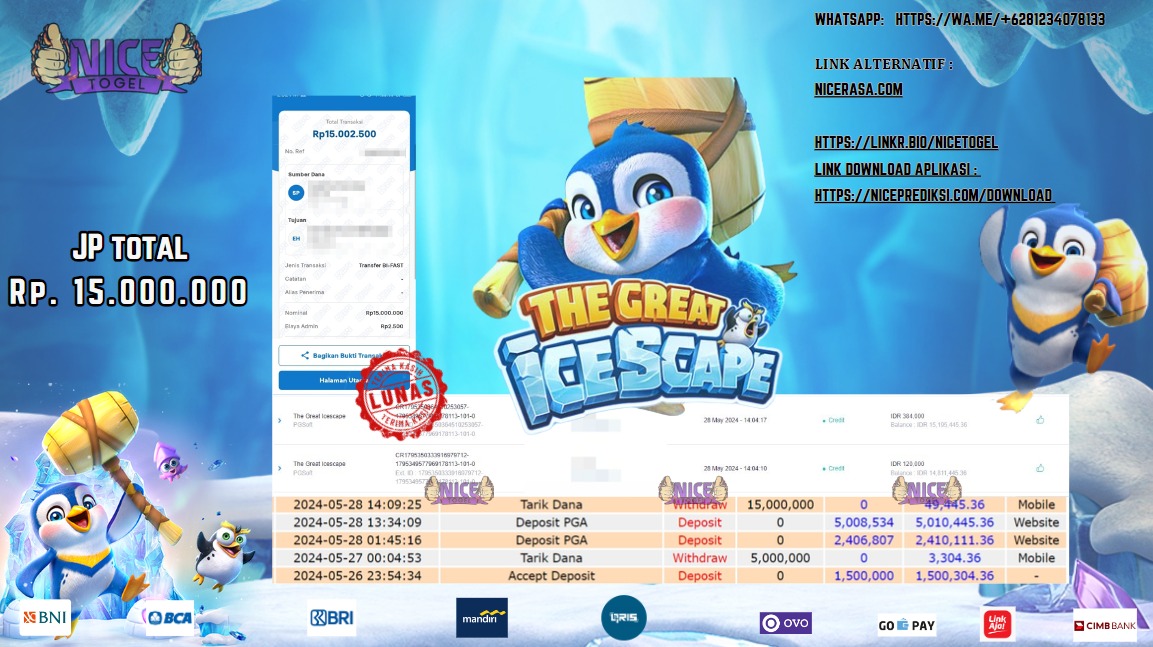 Selamat kepada User id : egy1** Telah berhasil mendapatkan kemenangan besar pada permainan THE GREAT ICESCAPE Dengan kemenangan Sebesar Rp.15.000.000,- Setelah mengisi formulir withdraw dengan kurung waktu hanya 5 – 10 menit pihak NICETOGEL sudah melakukan transfer kepada pemilik Userid dan dana sudah dapat di cairkan oleh pemenang. Bukti pembayaran yang kami berikan merupakan bukti pembayaran yang SAH / VALID yang langung di dapatkan melaui tanda transfer transaksi dari Bank yang di tuju.