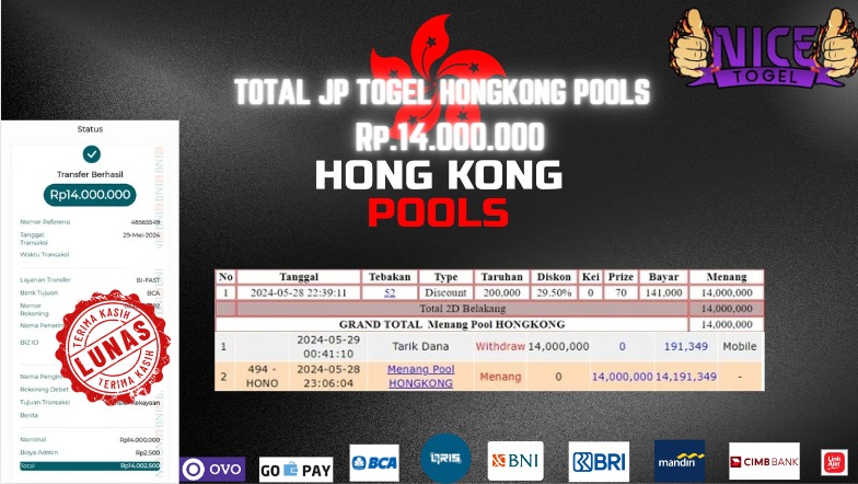 Selamat kepada User id : je** Telah berhasil mendapatkan kemenangan besar pada permainan TOGEL HONGKONG POOLS Dengan kemenangan Sebesar Rp.14.000.000,- Setelah mengisi formulir withdraw dengan kurung waktu hanya 5 – 10 menit pihak NICETOGEL sudah melakukan transfer kepada pemilik Userid dan dana sudah dapat di cairkan oleh pemenang. Bukti pembayaran yang kami berikan merupakan bukti pembayaran yang SAH / VALID yang langung di dapatkan melaui tanda transfer transaksi dari Bank yang di tuju.