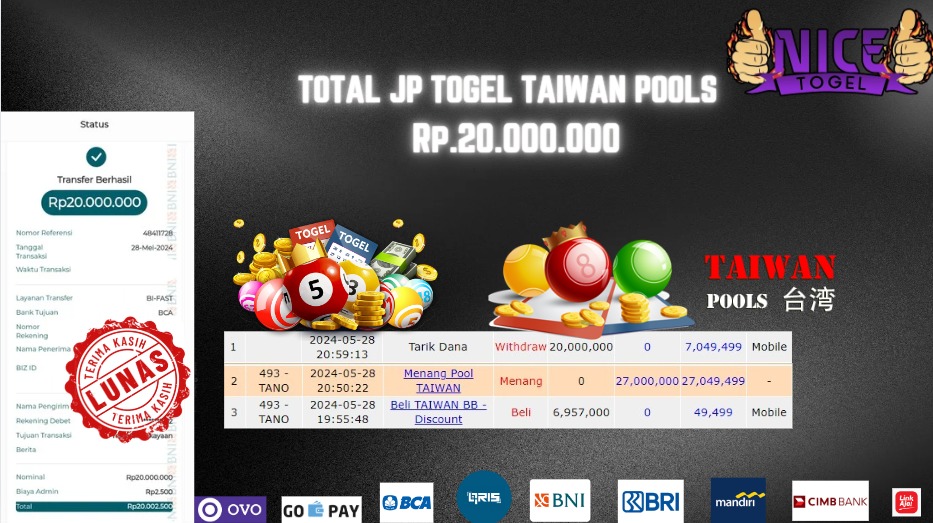 Selamat kepada User id : je** Telah berhasil mendapatkan kemenangan besar pada permainan TOGEL TAIWAN POOLS Dengan kemenangan Sebesar Rp.20.000.000,- Setelah mengisi formulir withdraw dengan kurung waktu hanya 5 – 10 menit pihak NICETOGEL sudah melakukan transfer kepada pemilik Userid dan dana sudah dapat di cairkan oleh pemenang. Bukti pembayaran yang kami berikan merupakan bukti pembayaran yang SAH / VALID yang langung di dapatkan melaui tanda transfer transaksi dari Bank yang di tuju.