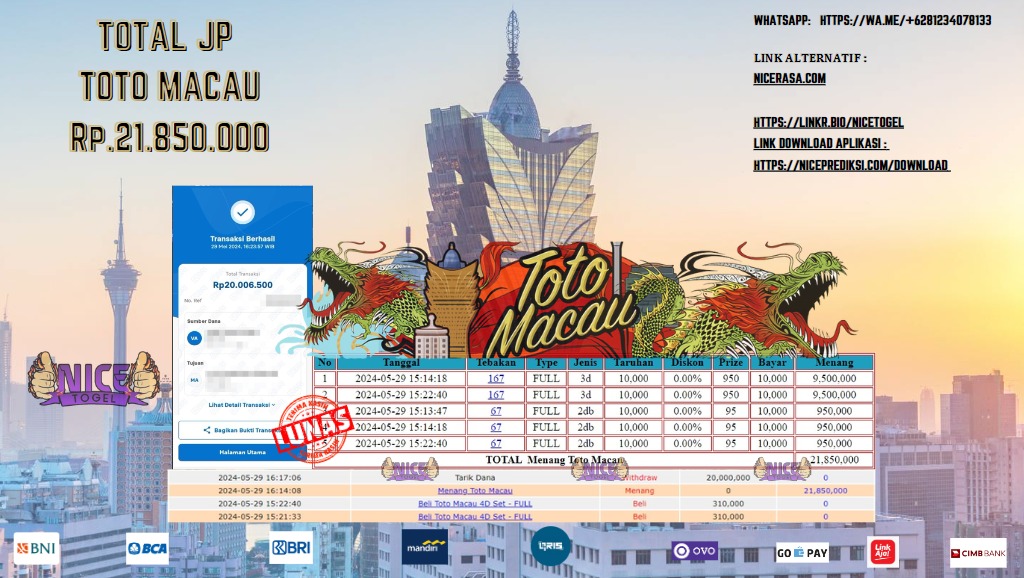 Selamat kepada User id : alka** Telah berhasil mendapatkan kemenangan besar pada permainan TOGEL TOTO MACAU Dengan kemenangan Sebesar Rp.21.850.000,- Setelah mengisi formulir withdraw dengan kurung waktu hanya 5 – 10 menit pihak NICETOGEL sudah melakukan transfer kepada pemilik Userid dan dana sudah dapat di cairkan oleh pemenang. Bukti pembayaran yang kami berikan merupakan bukti pembayaran yang SAH / VALID yang langung di dapatkan melaui tanda transfer transaksi dari Bank yang di tuju.