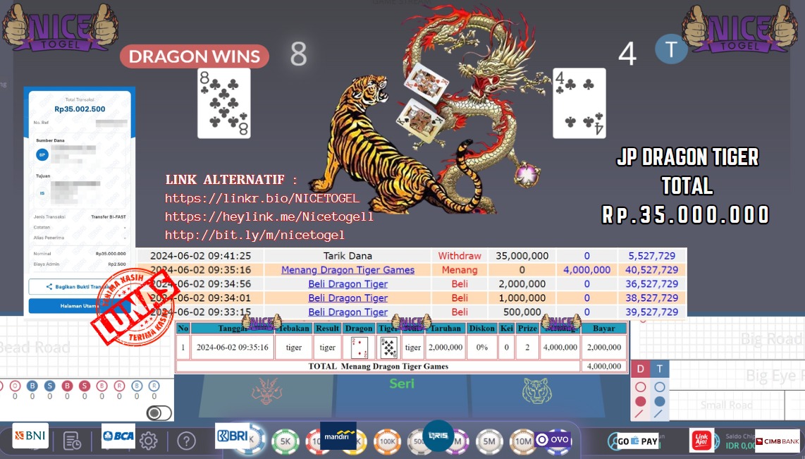 Selamat kepada User id : Loi** Telah berhasil mendapatkan kemenangan besar pada permainan DRAGON TIGER Dengan kemenangan Sebesar Rp. 35.000.000,- Setelah mengisi formulir withdraw dengan kurung waktu hanya 5 – 10 menit pihak NICETOGEL sudah melakukan transfer kepada pemilik Userid dan dana sudah dapat di cairkan oleh pemenang. Bukti pembayaran yang kami berikan merupakan bukti pembayaran yang SAH / VALID yang langung di dapatkan melaui tanda transfer transaksi dari Bank yang di tuju.