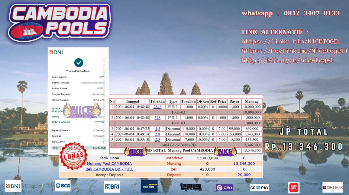 Selamat kepada User id : jp01** Telah berhasil mendapatkan kemenangan besar pada permainan TOGEL CAMBODIA Dengan kemenangan Sebesar Rp.13.346.000,- Setelah mengisi formulir withdraw dengan kurung waktu hanya 5 – 10 menit pihak NICETOGEL sudah melakukan transfer kepada pemilik Userid dan dana sudah dapat di cairkan oleh pemenang. Bukti pembayaran yang kami berikan merupakan bukti pembayaran yang SAH / VALID yang langung di dapatkan melaui tanda transfer transaksi dari Bank yang di tuju.