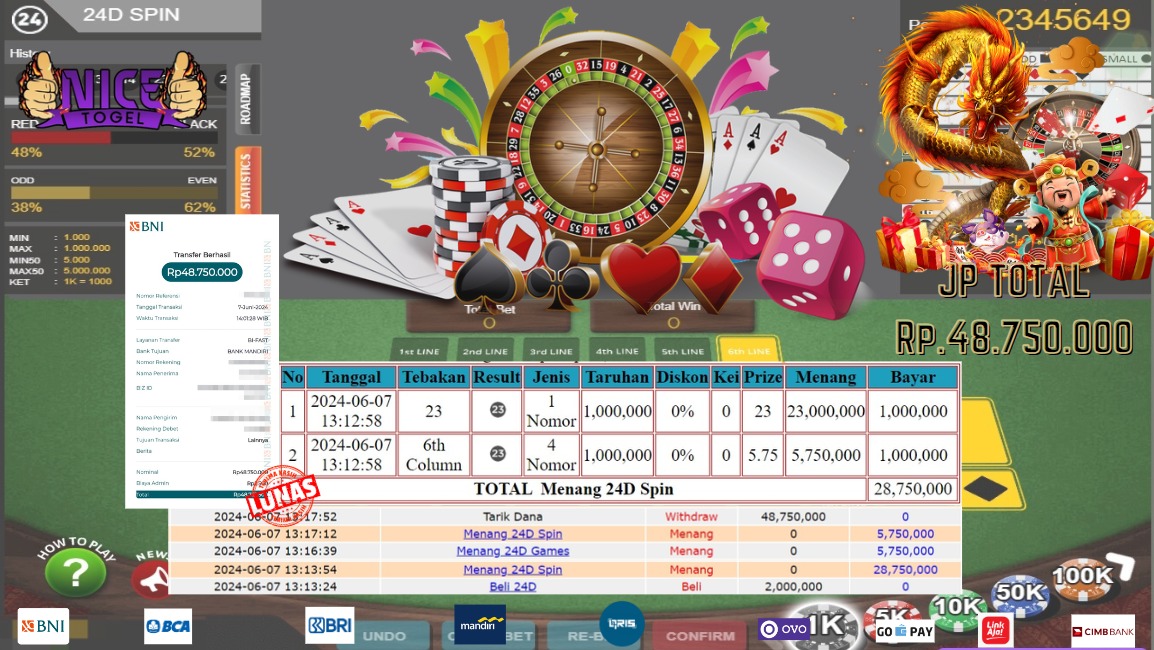 Selamat kepada User id : apa** Telah berhasil mendapatkan kemenangan besar pada permainan LIVEGAME 24D SPIN Dengan kemenangan Sebesar Rp.48.750.000,- Setelah mengisi formulir withdraw dengan kurung waktu hanya 5 – 10 menit pihak NICETOGEL sudah melakukan transfer kepada pemilik Userid dan dana sudah dapat di cairkan oleh pemenang. Bukti pembayaran yang kami berikan merupakan bukti pembayaran yang SAH / VALID yang langung di dapatkan melaui tanda transfer transaksi dari Bank yang di tuju.