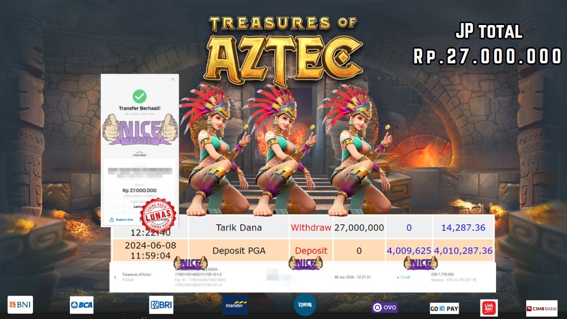 Selamat kepada User id : egy1** Telah berhasil mendapatkan kemenangan besar pada permainan TREASURES OF AZTEC  Dengan kemenangan Sebesar Rp.27.000.000,- Setelah mengisi formulir withdraw dengan kurung waktu hanya 5 – 10 menit pihak NICETOGEL sudah melakukan transfer kepada pemilik Userid dan dana sudah dapat di cairkan oleh pemenang. Bukti pembayaran yang kami berikan merupakan bukti pembayaran yang SAH / VALID yang langung di dapatkan melaui tanda transfer transaksi dari Bank yang di tuju.