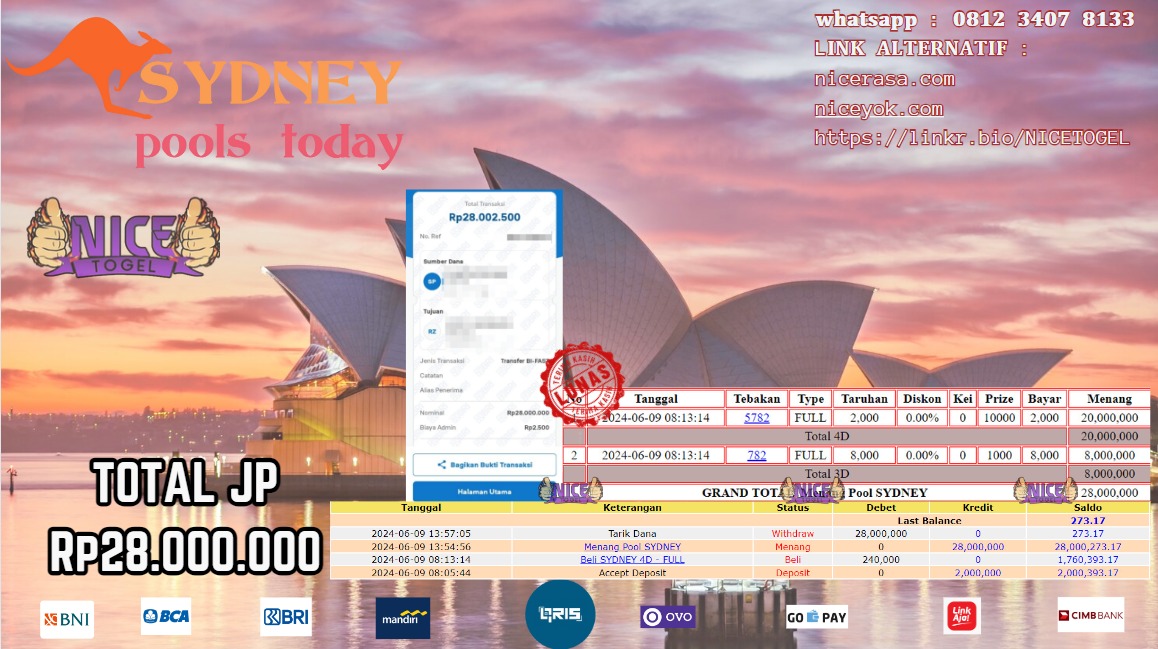 Selamat kepada User id : Qip** Telah berhasil mendapatkan kemenangan besar pada permainan TOGEL SYDNEY Dengan kemenangan Sebesar Rp.28.000.000,- Setelah mengisi formulir withdraw dengan kurung waktu hanya 5 – 10 menit pihak NICETOGEL sudah melakukan transfer kepada pemilik Userid dan dana sudah dapat di cairkan oleh pemenang. Bukti pembayaran yang kami berikan merupakan bukti pembayaran yang SAH / VALID yang langung di dapatkan melaui tanda transfer transaksi dari Bank yang di tuju.