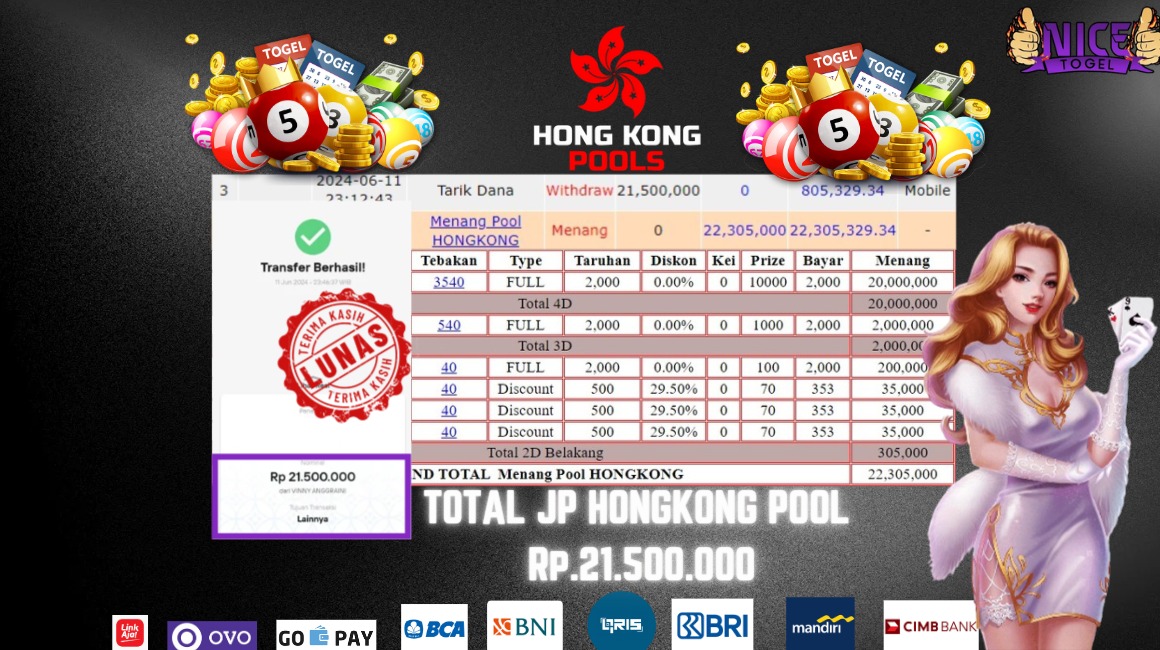 Selamat kepada User id : wa*** Telah berhasil mendapatkan kemenangan besar pada permainan TOGEL HONGKONG POOL Dengan kemenangan Sebesar Rp.21.500.000,- Setelah mengisi formulir withdraw dengan kurung waktu hanya 5 – 10 menit pihak NICETOGEL sudah melakukan transfer kepada pemilik Userid dan dana sudah dapat di cairkan oleh pemenang. Bukti pembayaran yang kami berikan merupakan bukti pembayaran yang SAH / VALID yang langung di dapatkan melaui tanda transfer transaksi dari Bank yang di tuju.