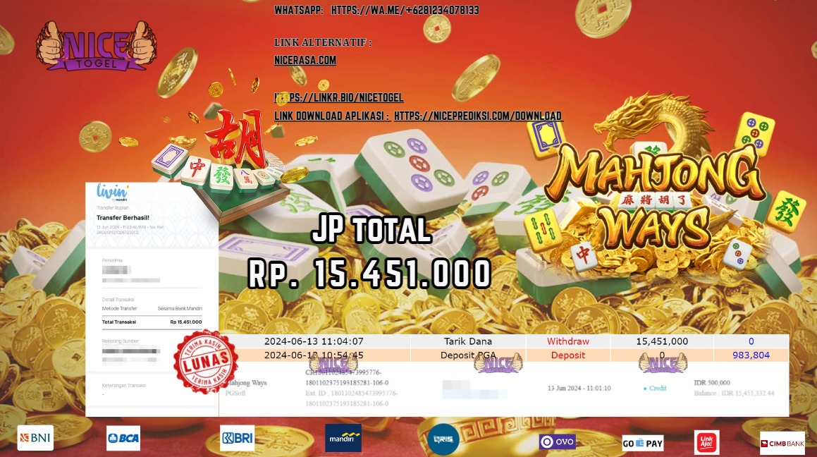 Selamat kepada User id : gra** Telah berhasil mendapatkan kemenangan besar pada permainan MAHJONG WAYS Dengan kemenangan Sebesar Rp.15.451.000,- Setelah mengisi formulir withdraw dengan kurung waktu hanya 5 – 10 menit pihak NICETOGEL sudah melakukan transfer kepada pemilik Userid dan dana sudah dapat di cairkan oleh pemenang. Bukti pembayaran yang kami berikan merupakan bukti pembayaran yang SAH / VALID yang langung di dapatkan melaui tanda transfer transaksi dari Bank yang di tuju.