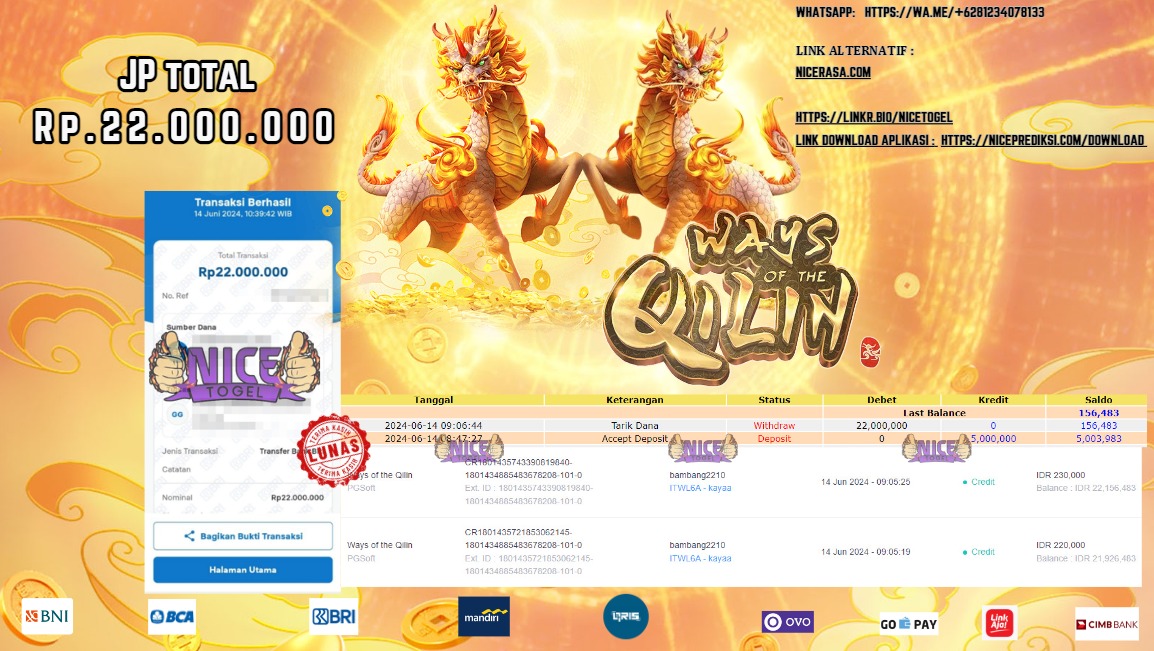 Selamat kepada User id : bamb** Telah berhasil mendapatkan kemenangan besar pada permainan WAYS OF THE QILIN Dengan kemenangan Sebesar Rp.22.000.000,- Setelah mengisi formulir withdraw dengan kurung waktu hanya 5 – 10 menit pihak NICETOGEL sudah melakukan transfer kepada pemilik Userid dan dana sudah dapat di cairkan oleh pemenang. Bukti pembayaran yang kami berikan merupakan bukti pembayaran yang SAH / VALID yang langung di dapatkan melaui tanda transfer transaksi dari Bank yang di tuju.