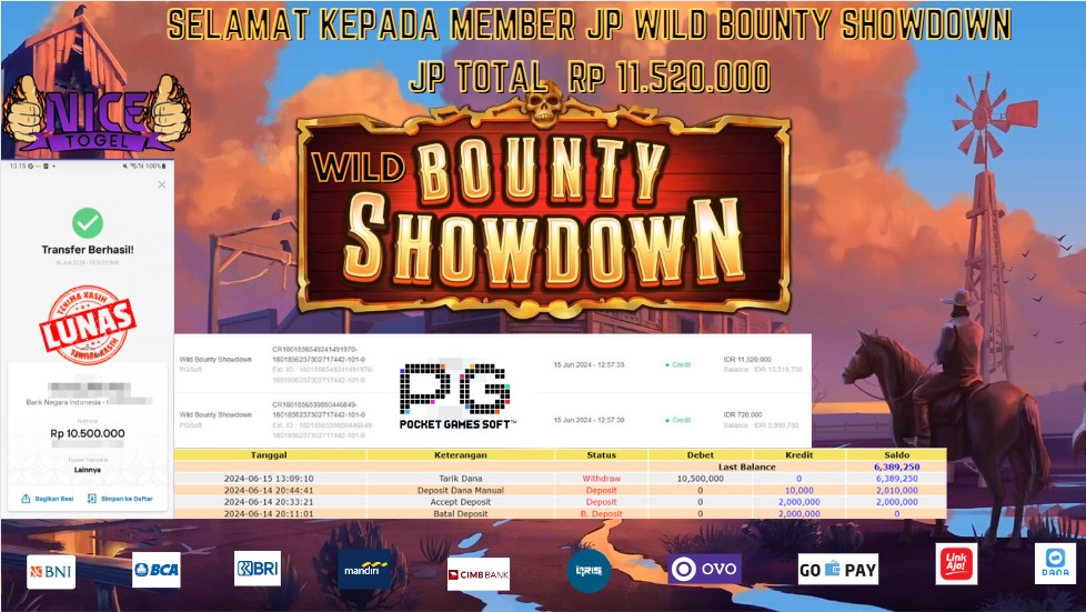 Selamat kepada User id : Ted**n Telah berhasil mendapatkan kemenangan besar pada permainan WILD BOUNTY SHOWDOWN Dengan kemenangan Sebesar Rp.11.520.000,- Setelah mengisi formulir withdraw dengan kurung waktu hanya 5 – 10 menit pihak NICETOGEL sudah melakukan transfer kepada pemilik Userid dan dana sudah dapat di cairkan oleh pemenang. Bukti pembayaran yang kami berikan merupakan bukti pembayaran yang SAH / VALID yang langung di dapatkan melaui tanda transfer transaksi dari Bank yang di tuju.