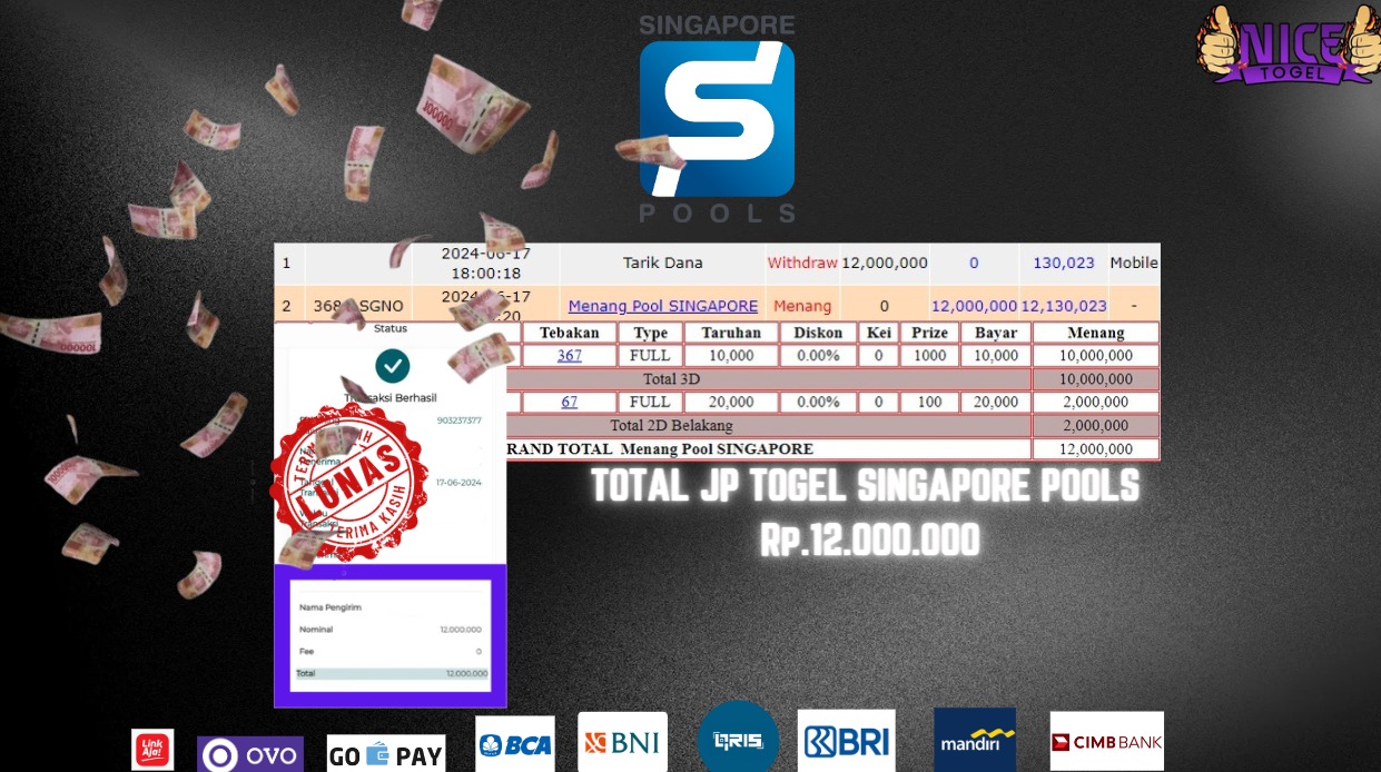 Selamat kepada User id : Ang***a Telah berhasil mendapatkan kemenangan besar pada permainan TOGEL SINGAPORE Dengan kemenangan Sebesar Rp. 12.000.000,- Setelah mengisi formulir withdraw dengan kurung waktu hanya 5 – 10 menit pihak NICETOGEL sudah melakukan transfer kepada pemilik Userid dan dana sudah dapat di cairkan oleh pemenang. Bukti pembayaran yang kami berikan merupakan bukti pembayaran yang SAH / VALID yang langung di dapatkan melaui tanda transfer transaksi dari Bank yang di tuju.