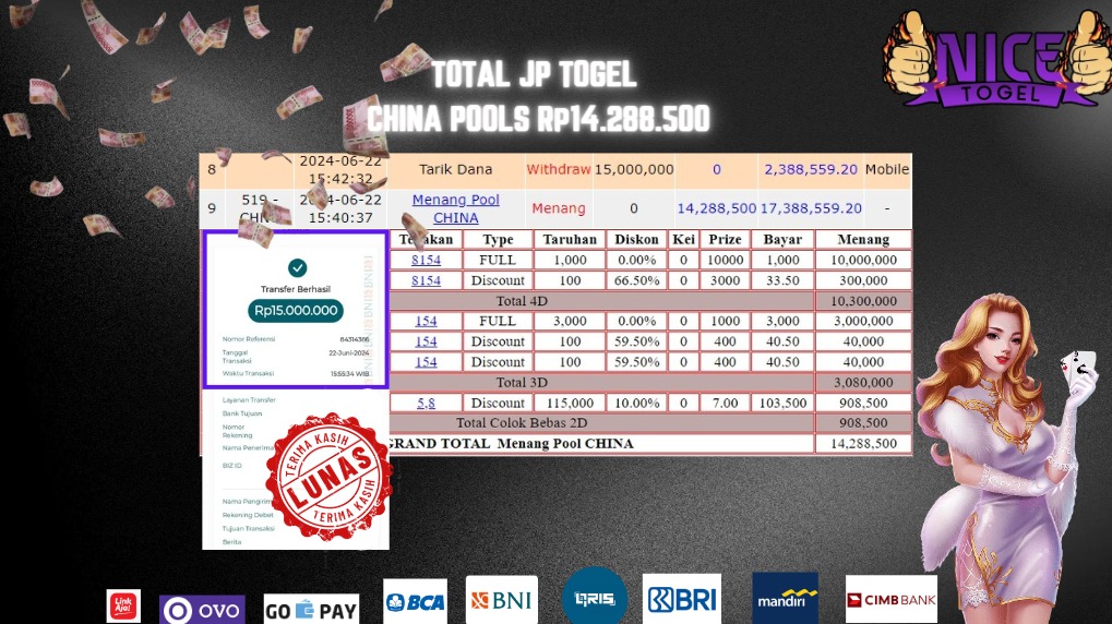 Selamat kepada User id : run*** Telah berhasil mendapatkan kemenangan besar pada permainan TOGEL CHINA POOLS Dengan kemenangan Sebesar Rp. 14.288.500,- Setelah mengisi formulir withdraw dengan kurung waktu hanya 5 – 10 menit pihak NICETOGEL sudah melakukan transfer kepada pemilik Userid dan dana sudah dapat di cairkan oleh pemenang. Bukti pembayaran yang kami berikan merupakan bukti pembayaran yang SAH / VALID yang langung di dapatkan melaui tanda transfer transaksi dari Bank yang di tuju.
