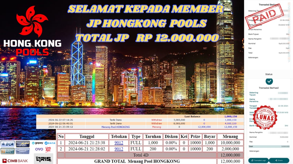 Selamat kepada User id : Ag***99 Telah berhasil mendapatkan kemenangan besar pada permainan TOGEL HONGKONG POOLS Dengan kemenangan Sebesar Rp. 12.000.000,- Setelah mengisi formulir withdraw dengan kurung waktu hanya 5 – 10 menit pihak NICETOGEL sudah melakukan transfer kepada pemilik Userid dan dana sudah dapat di cairkan oleh pemenang. Bukti pembayaran yang kami berikan merupakan bukti pembayaran yang SAH / VALID yang langung di dapatkan melaui tanda transfer transaksi dari Bank yang di tuju.