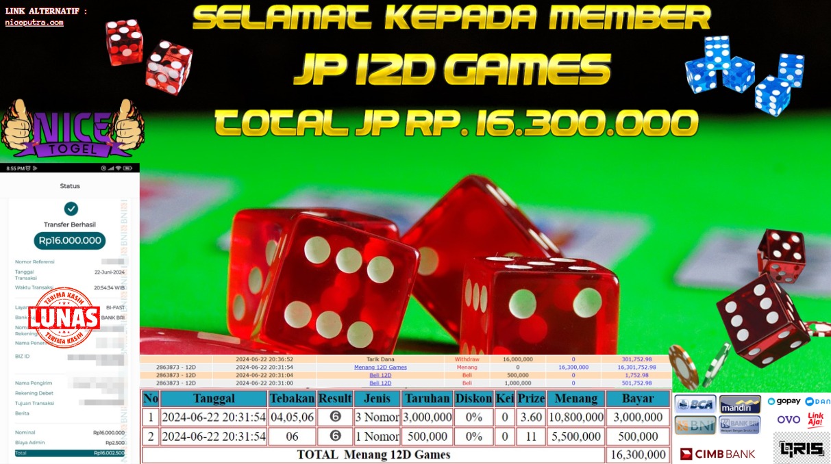 Selamat kepada User id : Su***y Telah berhasil mendapatkan kemenangan besar pada permainan LIVE GAMES 12D Dengan kemenangan Sebesar Rp. 16.300.000,- Setelah mengisi formulir withdraw dengan kurung waktu hanya 5 – 10 menit pihak NICETOGEL sudah melakukan transfer kepada pemilik Userid dan dana sudah dapat di cairkan oleh pemenang. Bukti pembayaran yang kami berikan merupakan bukti pembayaran yang SAH / VALID yang langung di dapatkan melaui tanda transfer transaksi dari Bank yang di tuju.