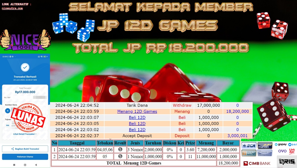 Selamat kepada User id : Su***yo Telah berhasil mendapatkan kemenangan besar pada permainan LIVE GAMES 12D Dengan kemenangan Sebesar Rp. 18.200.000,- Setelah mengisi formulir withdraw dengan kurung waktu hanya 5 – 10 menit pihak NICETOGEL sudah melakukan transfer kepada pemilik Userid dan dana sudah dapat di cairkan oleh pemenang. Bukti pembayaran yang kami berikan merupakan bukti pembayaran yang SAH / VALID yang langung di dapatkan melaui tanda transfer transaksi dari Bank yang di tuju.