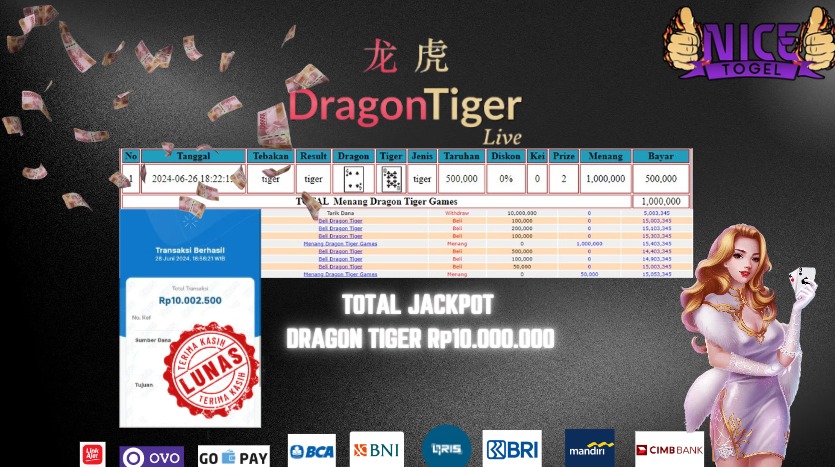 Selamat kepada User id : kom*** Telah berhasil mendapatkan kemenangan besar pada permainan LIVE GAMES DRAGON TIGER Dengan kemenangan Sebesar Rp. 10.000.000,- Setelah mengisi formulir withdraw dengan kurung waktu hanya 5 – 10 menit pihak NICETOGEL sudah melakukan transfer kepada pemilik Userid dan dana sudah dapat di cairkan oleh pemenang. Bukti pembayaran yang kami berikan merupakan bukti pembayaran yang SAH / VALID yang langung di dapatkan melaui tanda transfer transaksi dari Bank yang di tuju.