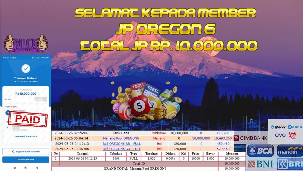Selamat kepada User id : Pe***gi Telah berhasil mendapatkan kemenangan besar pada permainan TOGEL OREGON 6 POOLS Dengan kemenangan Sebesar Rp. 10.000.000,- Setelah mengisi formulir withdraw dengan kurung waktu hanya 5 – 10 menit pihak NICETOGEL sudah melakukan transfer kepada pemilik Userid dan dana sudah dapat di cairkan oleh pemenang. Bukti pembayaran yang kami berikan merupakan bukti pembayaran yang SAH / VALID yang langung di dapatkan melaui tanda transfer transaksi dari Bank yang di tuju.