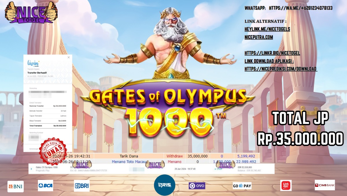 Selamat kepada User id : usm** Telah berhasil mendapatkan kemenangan besar pada permainan GATES OF OLYMPUS1000 Dengan kemenangan Sebesar Rp.35.000.000,- Setelah mengisi formulir withdraw dengan kurung waktu hanya 5 – 10 menit pihak NICETOGEL sudah melakukan transfer kepada pemilik Userid dan dana sudah dapat di cairkan oleh pemenang. Bukti pembayaran yang kami berikan merupakan bukti pembayaran yang SAH / VALID yang langung di dapatkan melaui tanda transfer transaksi dari Bank yang di tuju.