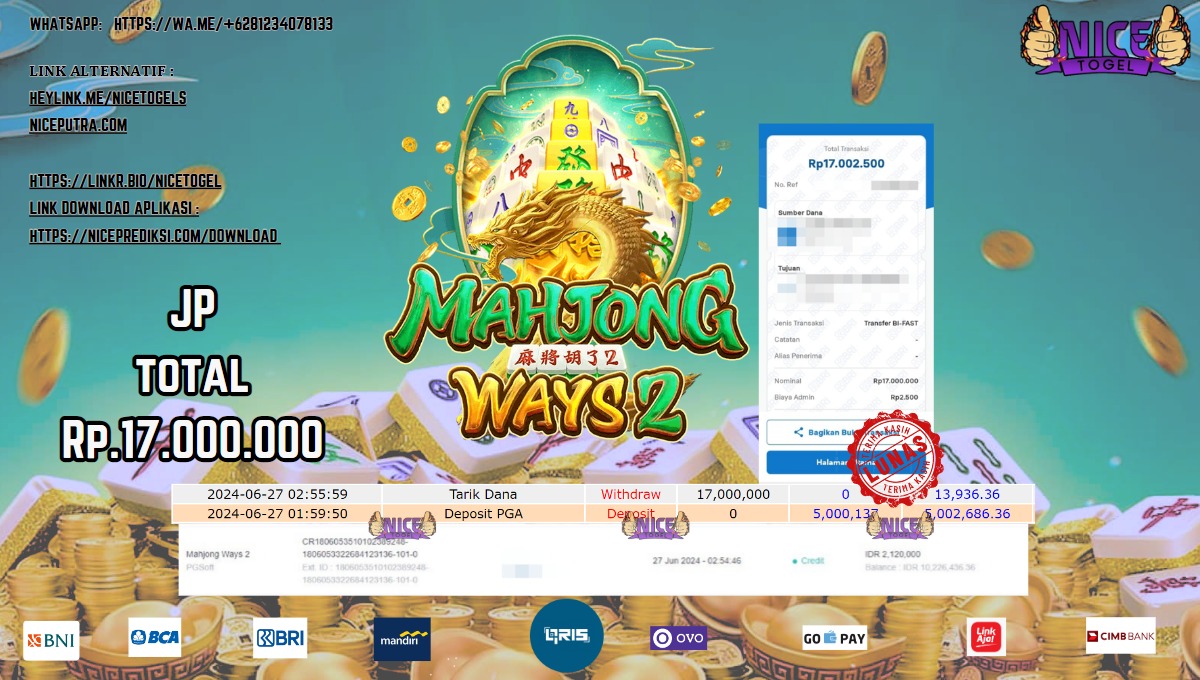 Selamat kepada User id : eg** Telah berhasil mendapatkan kemenangan besar pada permainan MAHYONG WAYS 2  Dengan kemenangan Sebesar Rp.17.000.000,- Setelah mengisi formulir withdraw dengan kurung waktu hanya 5 – 10 menit pihak NICETOGEL sudah melakukan transfer kepada pemilik Userid dan dana sudah dapat di cairkan oleh pemenang. Bukti pembayaran yang kami berikan merupakan bukti pembayaran yang SAH / VALID yang langung di dapatkan melaui tanda transfer transaksi dari Bank yang di tuju.