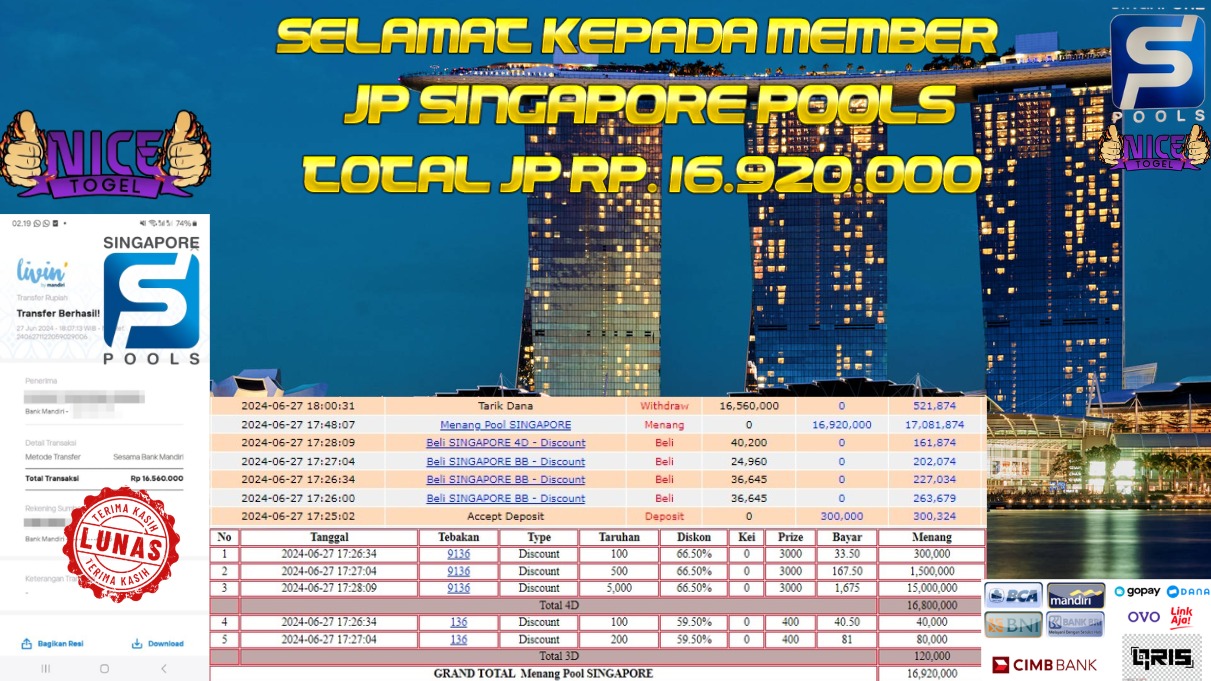 Selamat kepada User id : Arc***om Telah berhasil mendapatkan kemenangan besar pada permainan TOGEL SINGAPORE POOLS Dengan kemenangan Sebesar Rp. 16.920.000,- Setelah mengisi formulir withdraw dengan kurung waktu hanya 5 – 10 menit pihak NICETOGEL sudah melakukan transfer kepada pemilik Userid dan dana sudah dapat di cairkan oleh pemenang. Bukti pembayaran yang kami berikan merupakan bukti pembayaran yang SAH / VALID yang langung di dapatkan melaui tanda transfer transaksi dari Bank yang di tuju.
