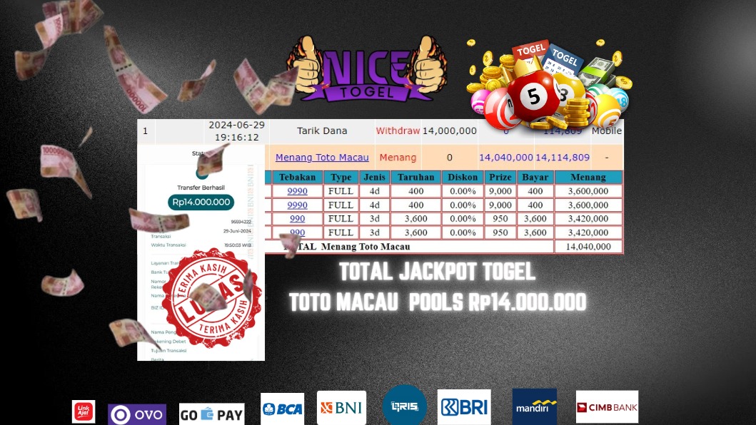 Selamat kepada User id : ki*** Telah berhasil mendapatkan kemenangan besar pada permainan TOGEL TOTO MACAU POOLS Dengan kemenangan Sebesar Rp. 14.000.000,- Setelah mengisi formulir withdraw dengan kurung waktu hanya 5 – 10 menit pihak NICETOGEL sudah melakukan transfer kepada pemilik Userid dan dana sudah dapat di cairkan oleh pemenang. Bukti pembayaran yang kami berikan merupakan bukti pembayaran yang SAH / VALID yang langung di dapatkan melaui tanda transfer transaksi dari Bank yang di tuju.