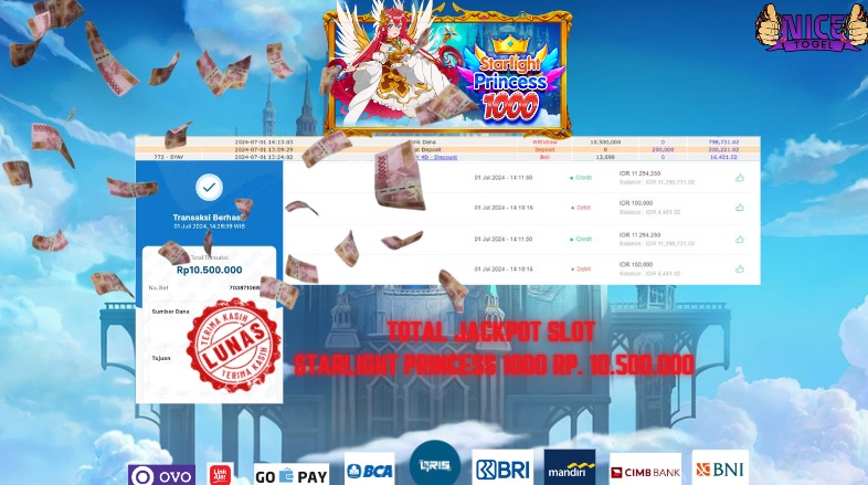 Selamat kepada User id : ba*** Telah berhasil mendapatkan kemenangan besar pada permainan SLOT STARLIGHT PRINCESS 1000 Dengan kemenangan Sebesar Rp. 10.500.000,- Setelah mengisi formulir withdraw dengan kurung waktu hanya 5 – 10 menit pihak NICETOGEL sudah melakukan transfer kepada pemilik Userid dan dana sudah dapat di cairkan oleh pemenang. Bukti pembayaran yang kami berikan merupakan bukti pembayaran yang SAH / VALID yang langung di dapatkan melaui tanda transfer transaksi dari Bank yang di tuju.