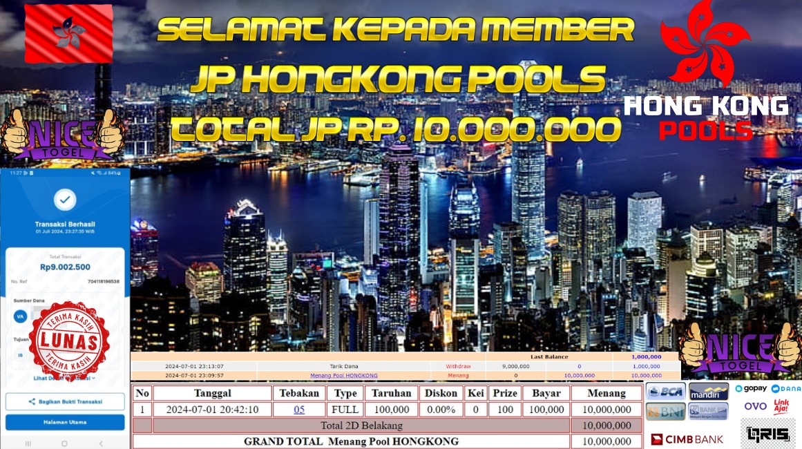 Selamat kepada User id : Put**99 Telah berhasil mendapatkan kemenangan besar pada permainan TOGEL HONGKONG POOLS Dengan kemenangan Sebesar Rp. 10.000.000,- Setelah mengisi formulir withdraw dengan kurung waktu hanya 5 – 10 menit pihak NICETOGEL sudah melakukan transfer kepada pemilik Userid dan dana sudah dapat di cairkan oleh pemenang. Bukti pembayaran yang kami berikan merupakan bukti pembayaran yang SAH / VALID yang langung di dapatkan melaui tanda transfer transaksi dari Bank yang di tuju.