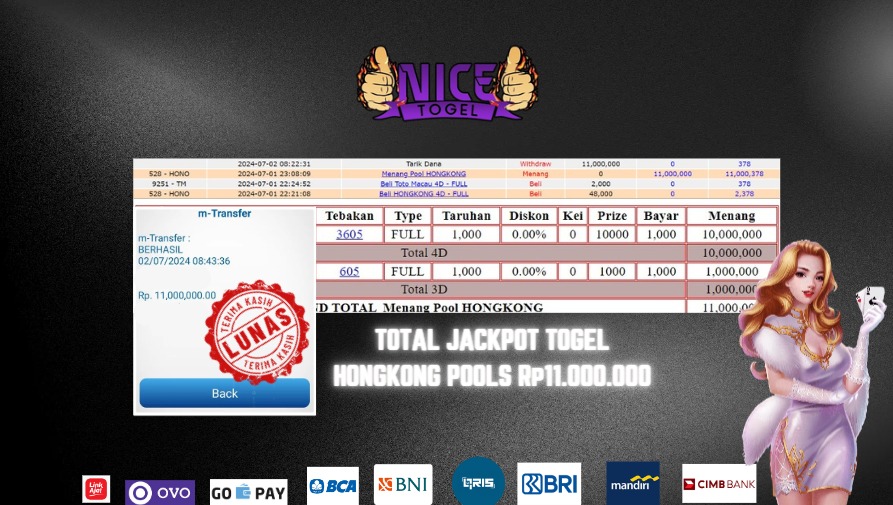 Selamat kepada User id : t** Telah berhasil mendapatkan kemenangan besar pada permainan TOGEL HONGKONG POOLS Dengan kemenangan Sebesar Rp. 11.000.000,- Setelah mengisi formulir withdraw dengan kurung waktu hanya 5 – 10 menit pihak NICETOGEL sudah melakukan transfer kepada pemilik Userid dan dana sudah dapat di cairkan oleh pemenang. Bukti pembayaran yang kami berikan merupakan bukti pembayaran yang SAH / VALID yang langung di dapatkan melaui tanda transfer transaksi dari Bank yang di tuju.