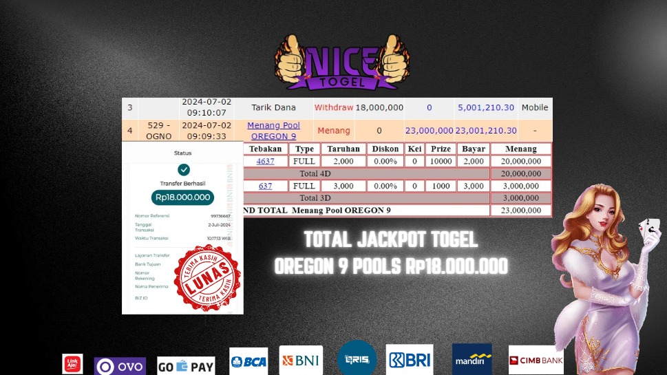 Selamat kepada User id : fer** Telah berhasil mendapatkan kemenangan besar pada permainan TOGEL OREGON 9 POOLS Dengan kemenangan Sebesar Rp. 18.000.000,- Setelah mengisi formulir withdraw dengan kurung waktu hanya 5 – 10 menit pihak NICETOGEL sudah melakukan transfer kepada pemilik Userid dan dana sudah dapat di cairkan oleh pemenang. Bukti pembayaran yang kami berikan merupakan bukti pembayaran yang SAH / VALID yang langung di dapatkan melaui tanda transfer transaksi dari Bank yang di tuju.