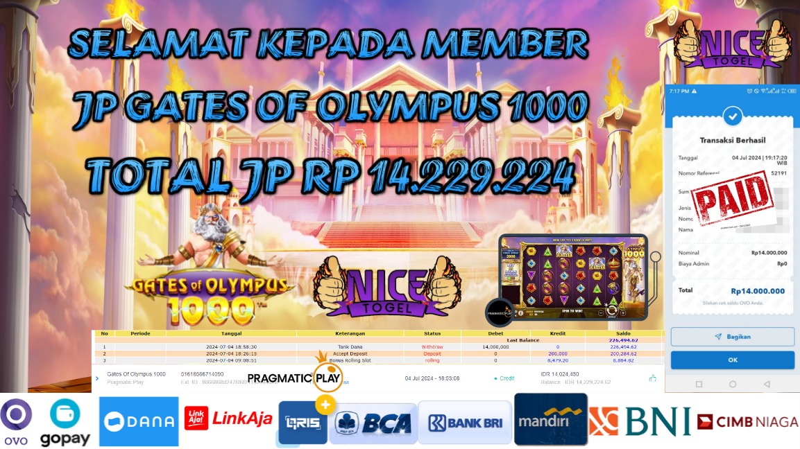 Selamat kepada User id : Aj***97 Telah berhasil mendapatkan kemenangan besar pada permainan GATES OF OLYMPUS 1000 Dengan kemenangan Sebesar Rp. 14.229.224,- Setelah mengisi formulir withdraw dengan kurung waktu hanya 5 – 10 menit pihak NICETOGEL sudah melakukan transfer kepada pemilik Userid dan dana sudah dapat di cairkan oleh pemenang. Bukti pembayaran yang kami berikan merupakan bukti pembayaran yang SAH / VALID yang langung di dapatkan melaui tanda transfer transaksi dari Bank yang di tuju.