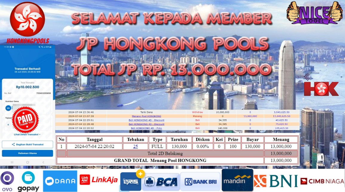 Selamat kepada User id : Al****ha**90 Telah berhasil mendapatkan kemenangan besar pada permainan TOGEL HONGKONG POOLS Dengan kemenangan Sebesar Rp. 13.000.000,- Setelah mengisi formulir withdraw dengan kurung waktu hanya 5 – 10 menit pihak NICETOGEL sudah melakukan transfer kepada pemilik Userid dan dana sudah dapat di cairkan oleh pemenang. Bukti pembayaran yang kami berikan merupakan bukti pembayaran yang SAH / VALID yang langung di dapatkan melaui tanda transfer transaksi dari Bank yang di tuju.