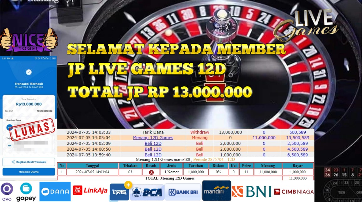 Selamat kepada User id : De***09 Telah berhasil mendapatkan kemenangan besar pada permainan LIVE GAMES 12D Dengan kemenangan Sebesar Rp. 13.000.000,- Setelah mengisi formulir withdraw dengan kurung waktu hanya 5 – 10 menit pihak NICETOGEL sudah melakukan transfer kepada pemilik Userid dan dana sudah dapat di cairkan oleh pemenang. Bukti pembayaran yang kami berikan merupakan bukti pembayaran yang SAH / VALID yang langung di dapatkan melaui tanda transfer transaksi dari Bank yang di tuju.