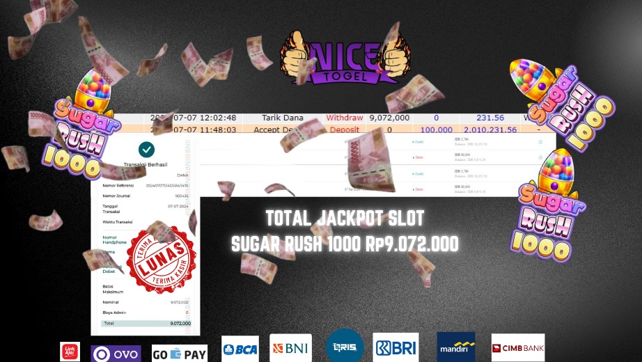Selamat kepada User id : da*** Telah berhasil mendapatkan kemenangan besar pada permainan SLOT SUGAR RUSH 1000 Dengan kemenangan Sebesar Rp. 9.072.000,- Setelah mengisi formulir withdraw dengan kurung waktu hanya 5 – 10 menit pihak NICETOGEL sudah melakukan transfer kepada pemilik Userid dan dana sudah dapat di cairkan oleh pemenang. Bukti pembayaran yang kami berikan merupakan bukti pembayaran yang SAH / VALID yang langung di dapatkan melaui tanda transfer transaksi dari Bank yang di tuju.