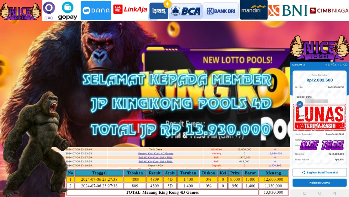 Selamat kepada User id : XB***L Telah berhasil mendapatkan kemenangan besar pada permainan TOGEL KINGKONG POOLS 4D Dengan kemenangan Sebesar Rp. 13.930.000,- Setelah mengisi formulir withdraw dengan kurung waktu hanya 5 – 10 menit pihak NICETOGEL sudah melakukan transfer kepada pemilik Userid dan dana sudah dapat di cairkan oleh pemenang. Bukti pembayaran yang kami berikan merupakan bukti pembayaran yang SAH / VALID yang langung di dapatkan melaui tanda transfer transaksi dari Bank yang di tuju.