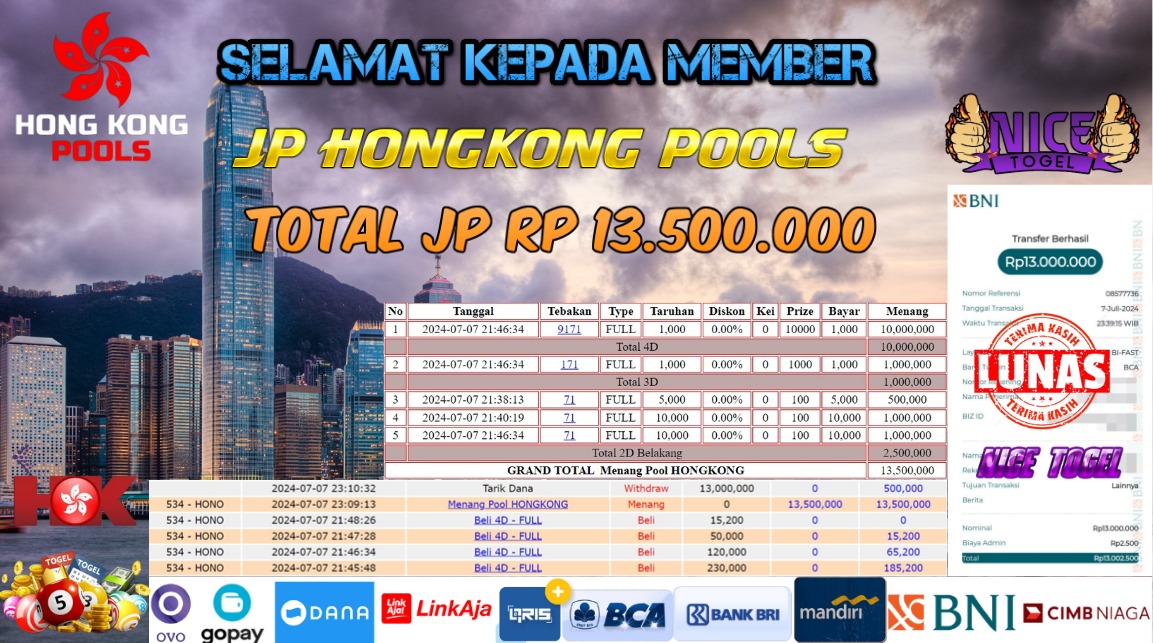 Selamat kepada User id : Sim****E Telah berhasil mendapatkan kemenangan besar pada permainan TOGEL HONGKONG POOLS Dengan kemenangan Sebesar Rp. 13.500.000,- Setelah mengisi formulir withdraw dengan kurung waktu hanya 5 – 10 menit pihak NICETOGEL sudah melakukan transfer kepada pemilik Userid dan dana sudah dapat di cairkan oleh pemenang. Bukti pembayaran yang kami berikan merupakan bukti pembayaran yang SAH / VALID yang langung di dapatkan melaui tanda transfer transaksi dari Bank yang di tuju.