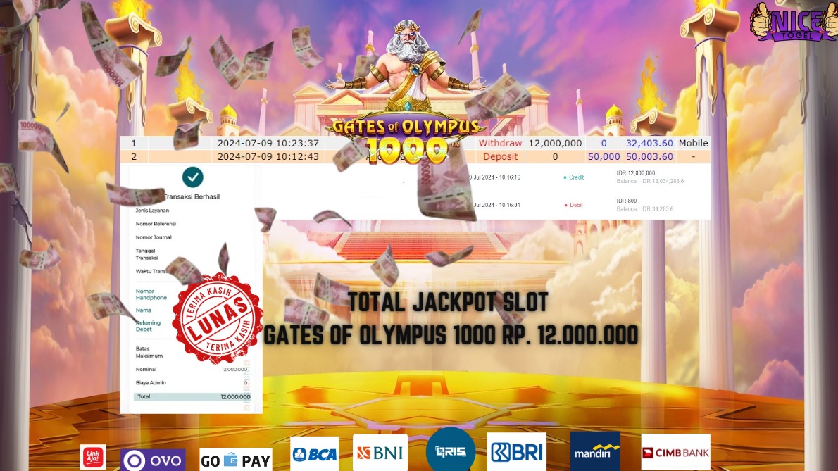 Selamat kepada User id : h***** Telah berhasil mendapatkan kemenangan besar pada permainan SLOT GATES OF OLYMPUS 1000 Dengan kemenangan Sebesar Rp.12.000.000,- Setelah mengisi formulir withdraw dengan kurung waktu hanya 5 – 10 menit pihak NICETOGEL sudah melakukan transfer kepada pemilik Userid dan dana sudah dapat di cairkan oleh pemenang. Bukti pembayaran yang kami berikan merupakan bukti pembayaran yang SAH / VALID yang langung di dapatkan melaui tanda transfer transaksi dari Bank yang di tuju.