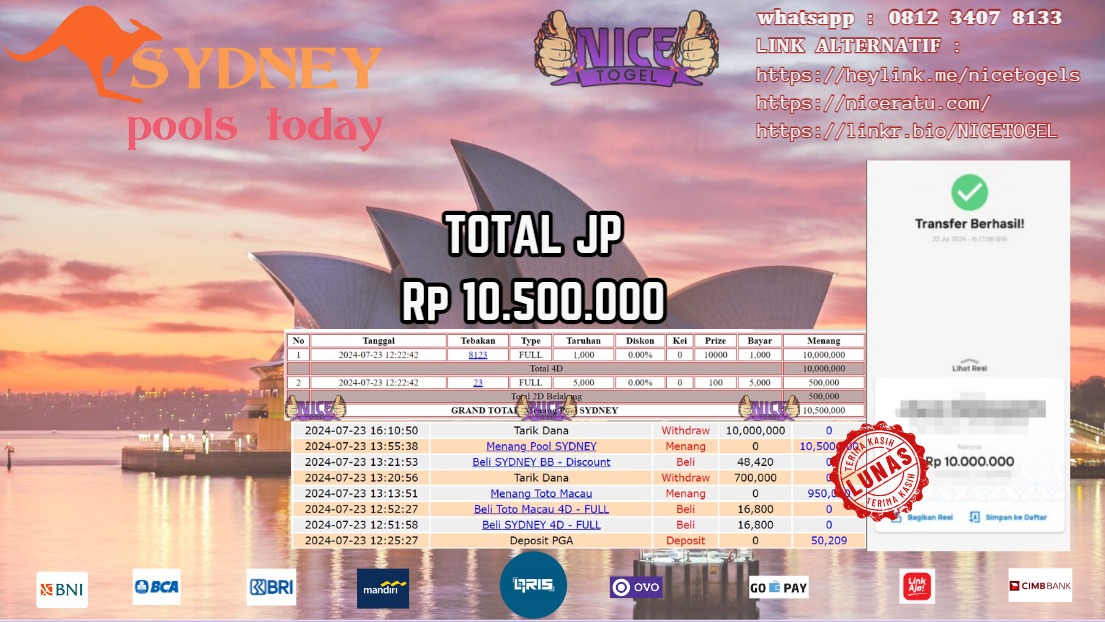 Selamat kepada User id : Erti** Telah berhasil mendapatkan kemenangan besar pada permainan TOGEL SYDNEY Dengan kemenangan Sebesar Rp.10.500.000,- Setelah mengisi formulir withdraw dengan kurung waktu hanya 5 – 10 menit pihak NICETOGEL sudah melakukan transfer kepada pemilik Userid dan dana sudah dapat di cairkan oleh pemenang. Bukti pembayaran yang kami berikan merupakan bukti pembayaran yang SAH / VALID yang langung di dapatkan melaui tanda transfer transaksi dari Bank yang di tuju.
